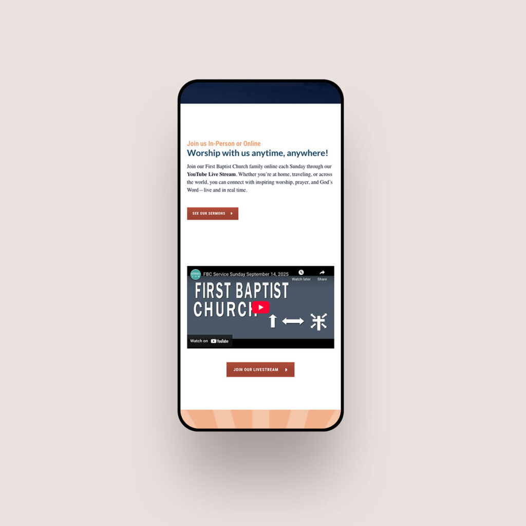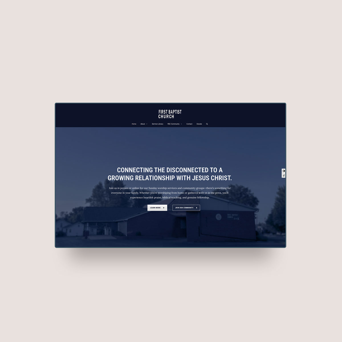 The finished site gives First Baptist Church a stable, welcoming online home — one that supports worship, connection, and community leadership.