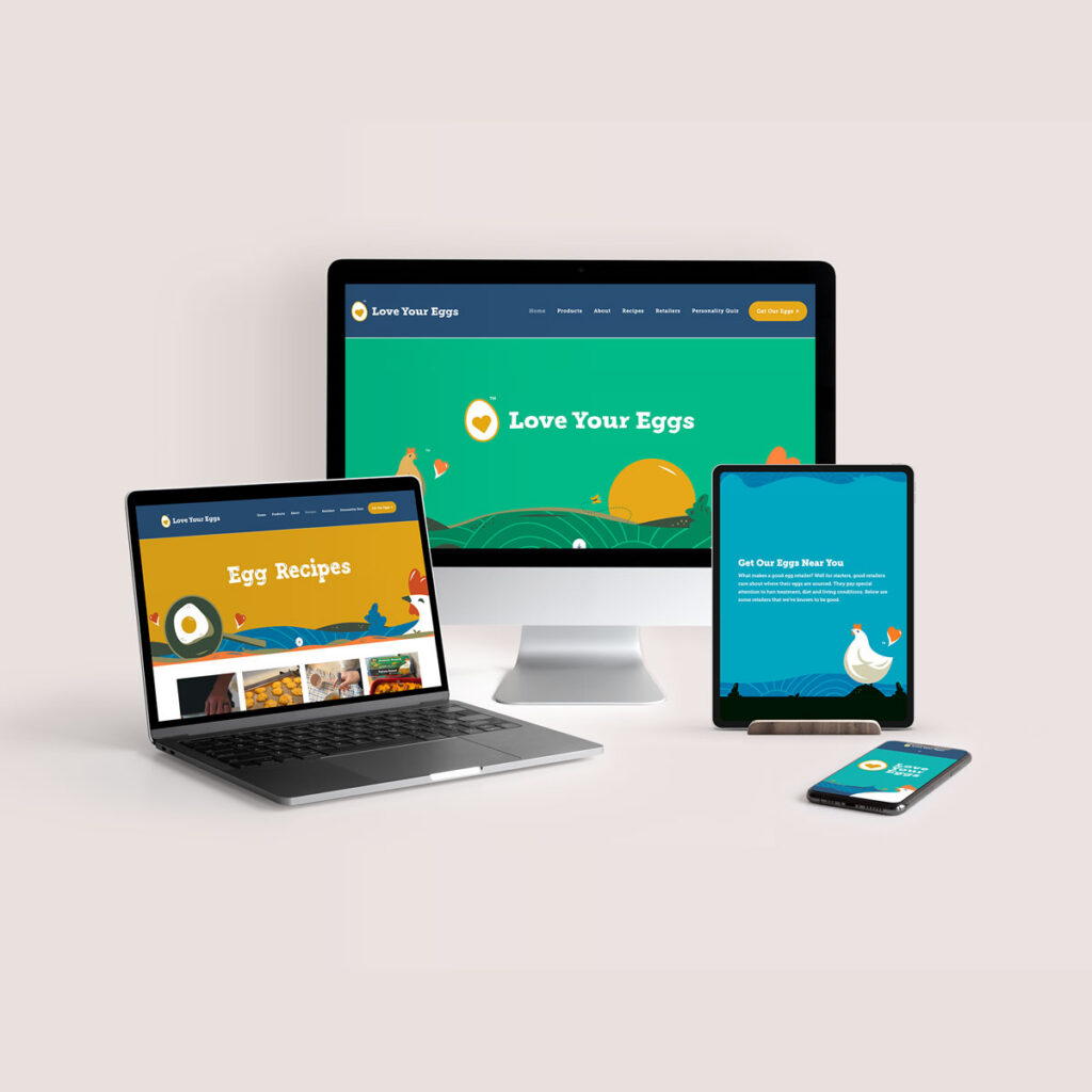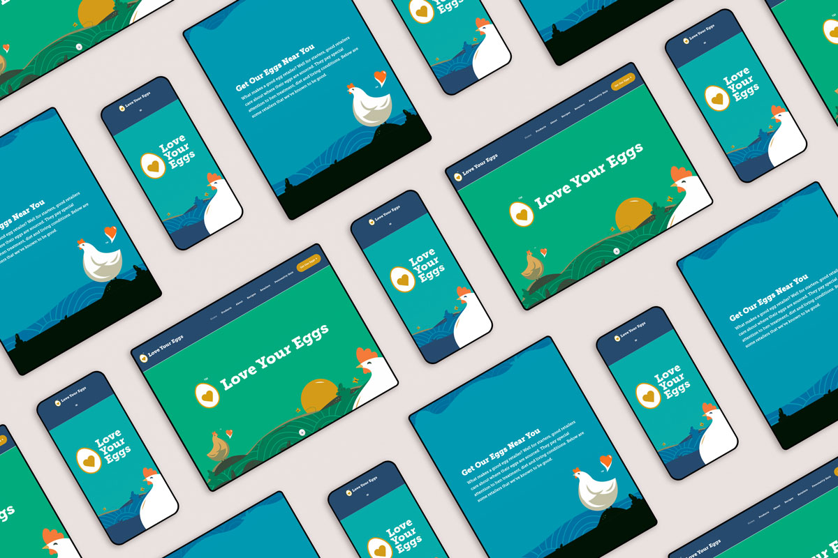 The design draws directly from the Love Your Eggs packaging — color, illustration style, and tone — expanding it into a layered digital system.