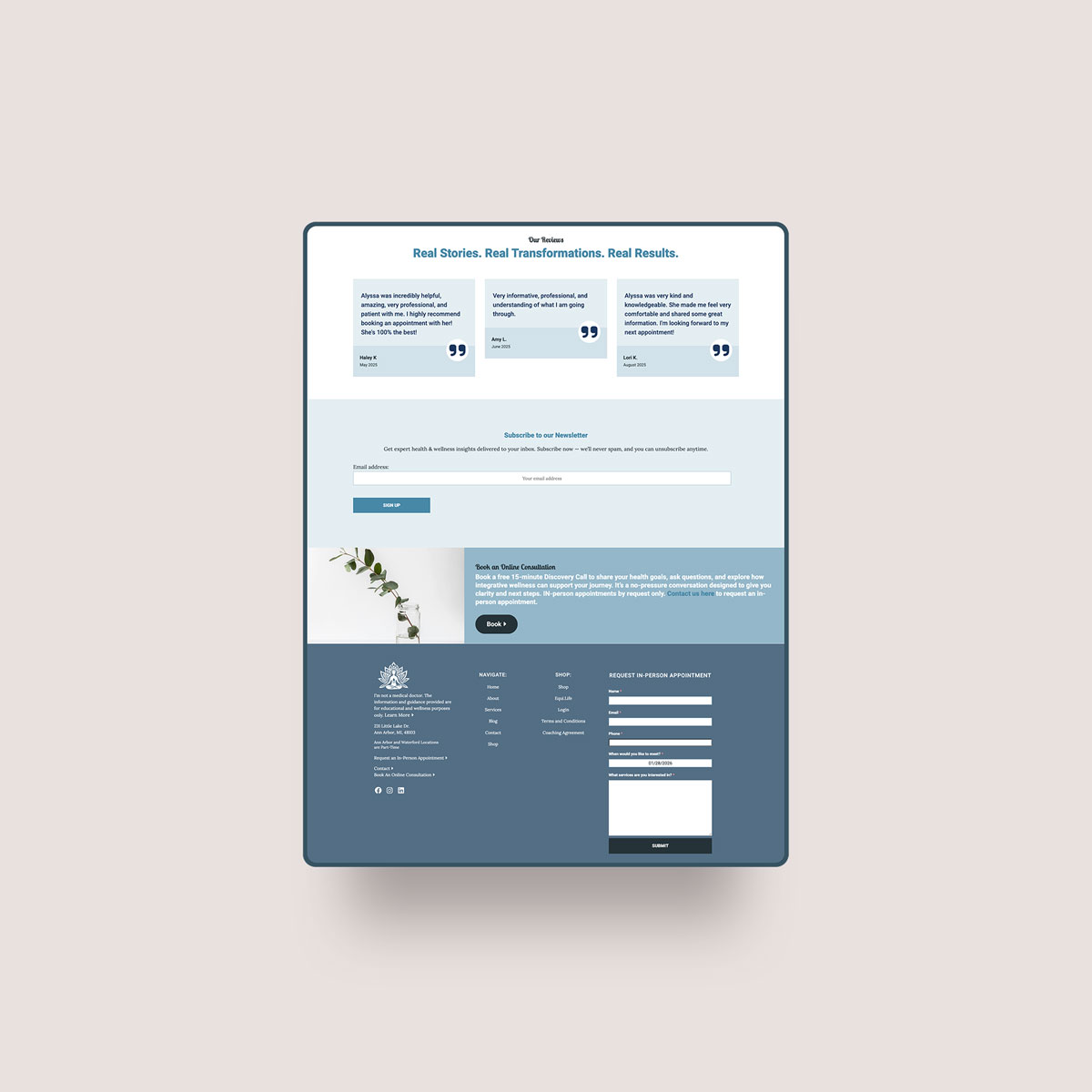 At the same time, the site needed to communicate Alyssa’s personal story and philosophy without feeling overwhelming, clinical, or overly sales-driven.